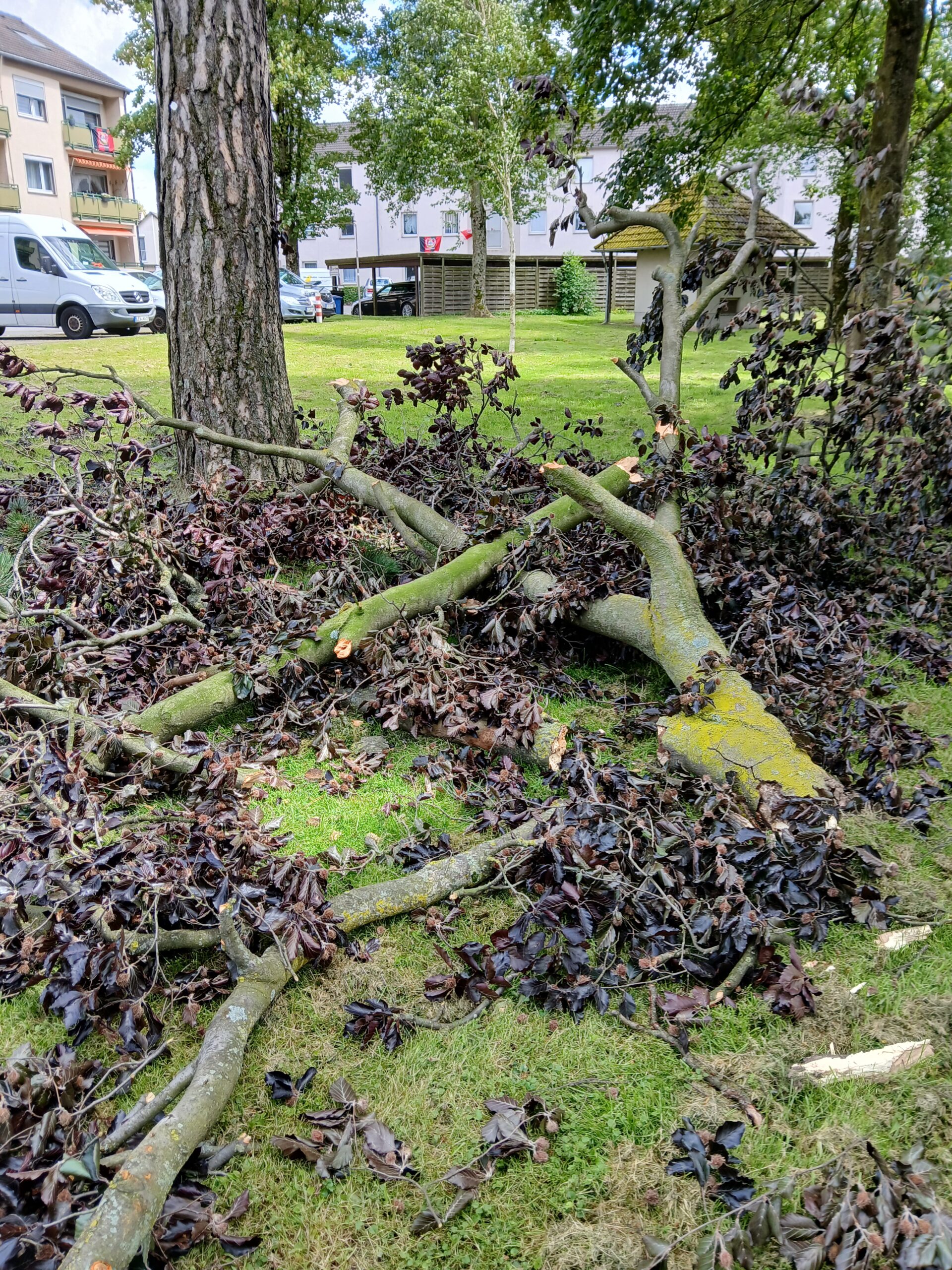 Am Samstag, den 15.06.2024, vermutlich in den frühen Morgenstunden, stürzte die Krone eines ca. 20 m hohen Baumes aufgrund von Sturmböen auf die Rasenfläche. Zahlreiche abgebrochene Äste hatten sich im Baum verkeilt und drohten herabzustürzen. Durch einen Anruf eines Bürgers alarmiert, rückte die Leverkusener Feuerwehr gegen 15:00 Uhr mit Großgerät an und beseitigte in einer fast zweistündigen Aktion die von dem Baum ausgehenden Gefahrenstellen (siehe Fotos).